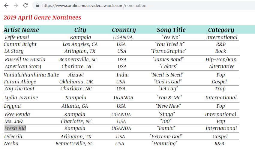 Uganda’s youngest rapper Patrick Ssenyonjo commonly known by his stage name ‘Fresh Kid’ has been nominated in the 2019 Carolina Music Video Awards.