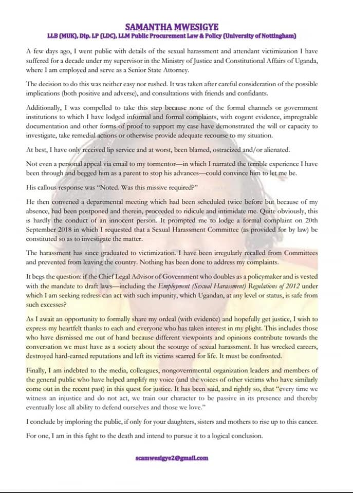 Samantha Mwesigye, the Senior State Attorney in the Ministry of Justice and Constitutional Affairs, in the latest letter, says government agencies that she sought help from after being sexually harassed by her supervisor over a decade, have neglected her to the extent that she has been excluded from committee meetings as well as being blocked from flying out of the country on some occasions.