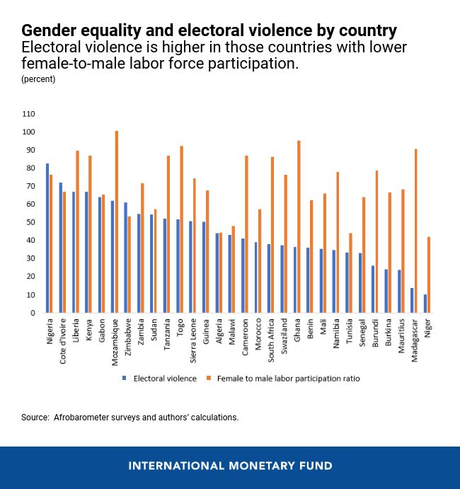 Our Chart of the Week taken from recent IMF research suggests that women’s participation in the workforce could make election-related violence less likely in Africa. Nearly half the individuals surveyed say that they fear becoming a victim of electoral violence. That figure declines by a quarter if the female-to-male labor force participation ratio increases by 5 per cent points.