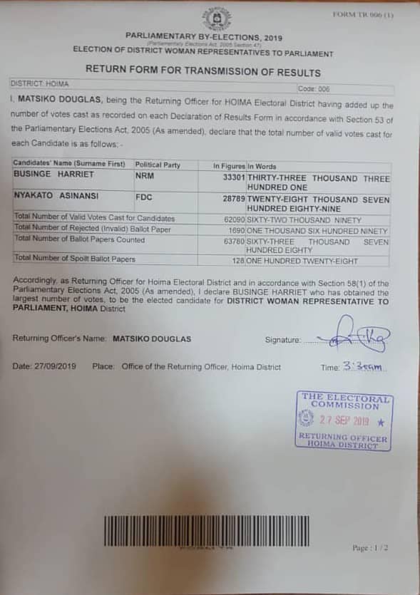 Hoima district returning officer Matsiko Douglass declared Businge winner of the women’s seat after beating her rival Nyakato Asinasi of the Forum for Democratic change with 33,301 votes against twenty 28,789.