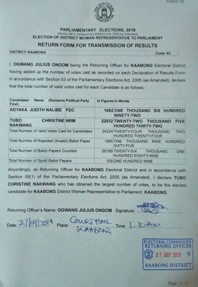 Meanwhile NRM was able to win Kaabong district as Christine Tubo Nakwang got 22532 votes against FDC rival Judith Adyaka Nalibe who got 1692 votes though she had withdrawn from the race against the wishes of her party.