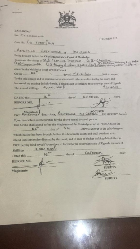 Veteran musician and heiress to the family Angela Katatumba has been charged with criminal trespass and fraud and is to be brought to Chief Magistrate Court Makindye on November 4, 2019.