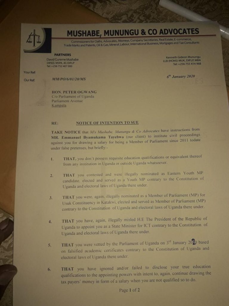 According to Mushabe, Munungu & Co. Advocates that intend to sue Hon. Ogwang with instructions from their client Mr. Emmanuel Byamukama Tayebwa, they say Mr. Ogwang doesn’t possess requisite education qualifications or equivalent thereof from any institution in Uganda or outside Uganda.