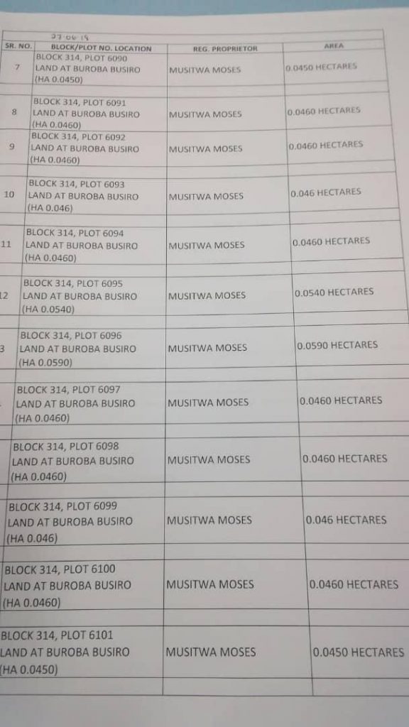 The plots are located in Busiro on Block 314. They are plots No. 6090, 6091, 6092, 6093, 6094, 6095, 6096, 6097, 6098, 6099, 6100 and 6101. The plots range from 0.0450-0.0590 hectares.