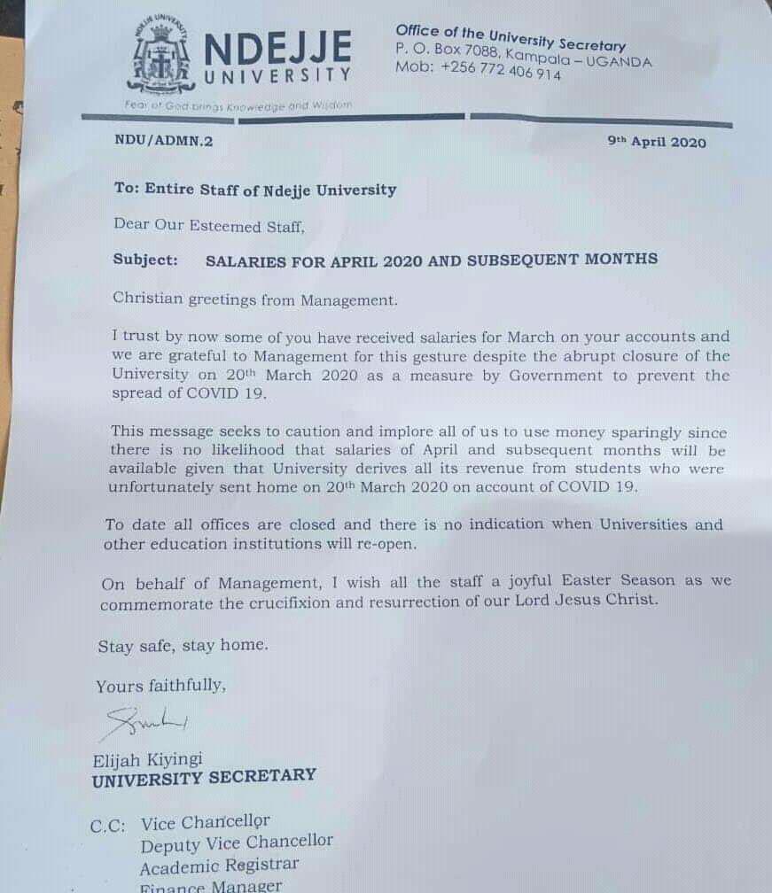 “This message seeks to caution and implore all of us to use money sparingly since there is no likelihood that salaries of April and subsequent months will be available given that university derives its revenue from students who were unfortunately sent home on March 20, 2020 on account of #COVID-19. Reads staff memo signed by Elijah Kiyingi, the University Secretary.