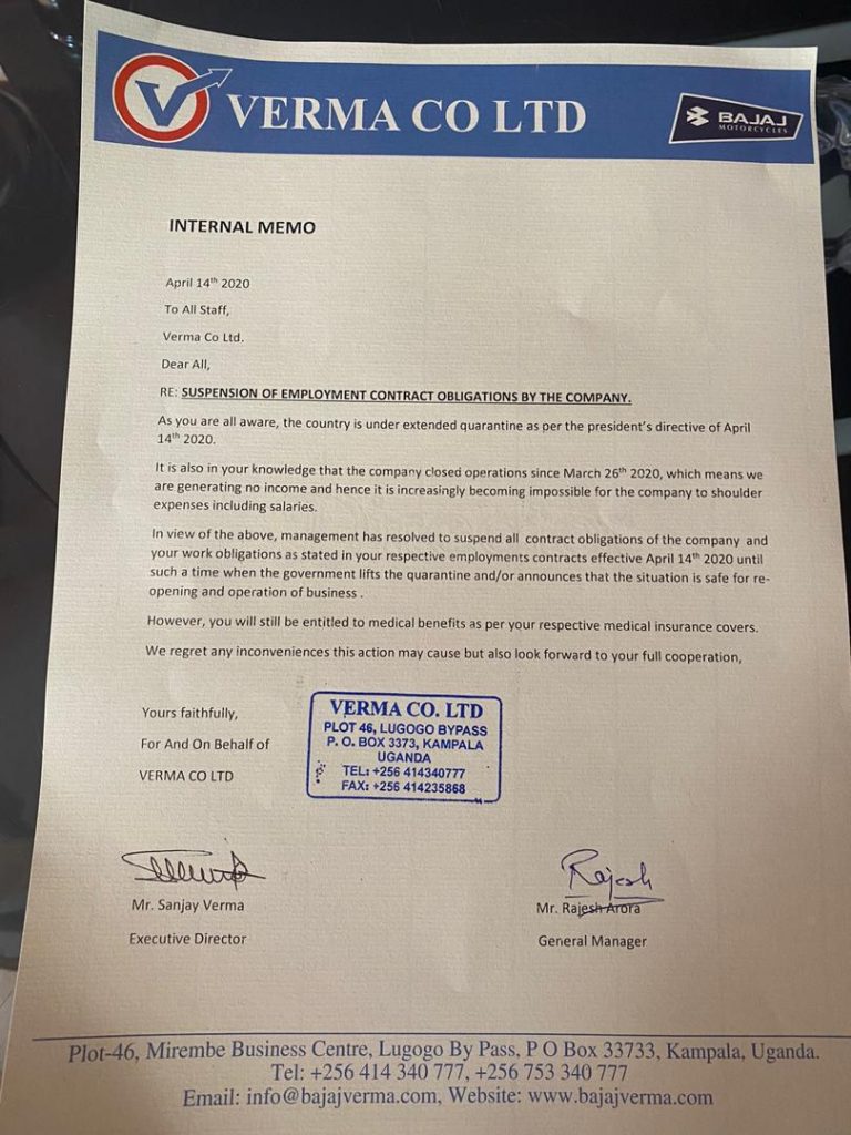 “As you are aware, the country is under extended quarantine as per the president’s directives of April 14, 2020. It is also in your knowledge that the country closed operations since March 26, 2020, which means we are generating no income and hence it is increasingly becoming impossible for the company to shoulder expenses including salaries” reads an internal memo.