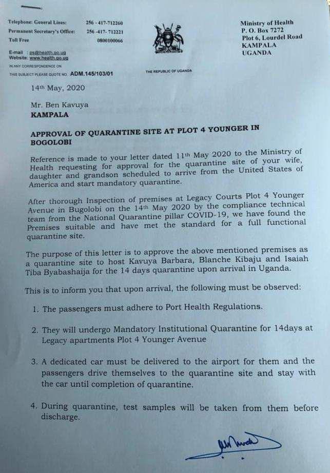 Sam Kuteesa’s authorisation letter was closely followed by a letter from Dr Henry Mwebesa, the Director General Health Services, controversially approving Legacy Courts Plot Four Younger in Bugolobi as a quarantine site for Ben Kavuya’s family.