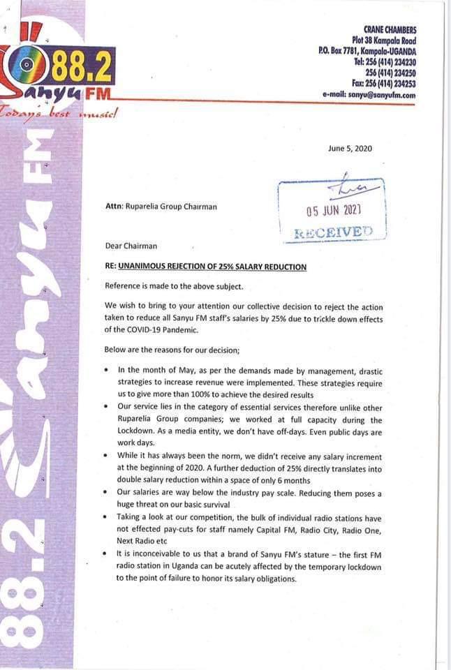 But after giving it a second thought,some of the sacked staff met with Sanyu FM top management on Friday,apologised over their actions and indicated that they were willing to take the 25% paycut.