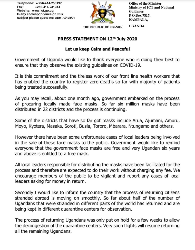 In a press statement dated July 12, ICT and National Guidance Minister, Judith Nabakooba said that there have been unfortunate cases of local leaders being involved in the sale of face masks to the public.