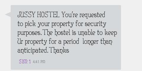 Eagle online also learnt of a message that was sent to students of Jussy hostel reading “You are requested to pick your property for security purposes. The hostel is unable to keep your property for a period longer than anticipated”.