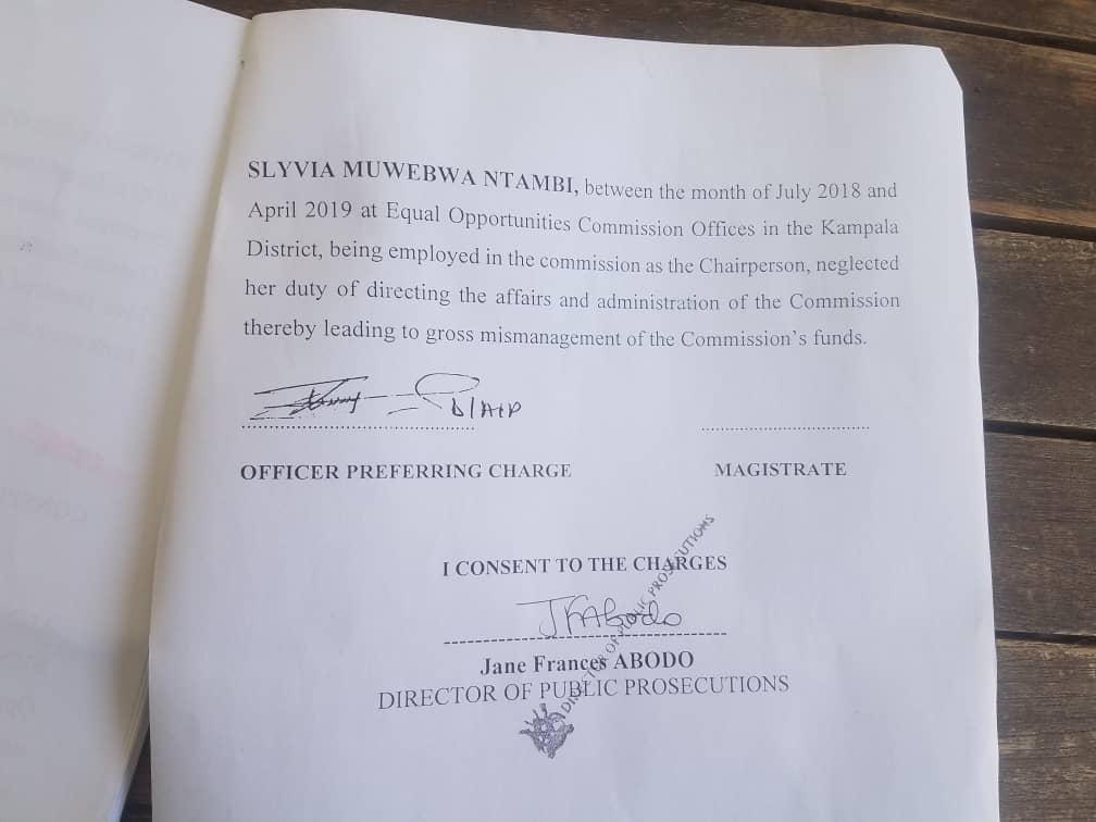 The Chairperson of Equal opportunities Commission (EOC) Mrs. Sylvia Muwebwa Ntambi has been charged with corruption.