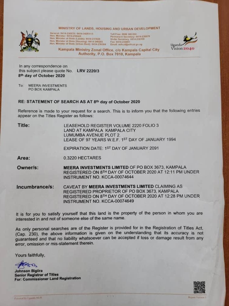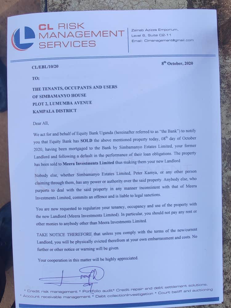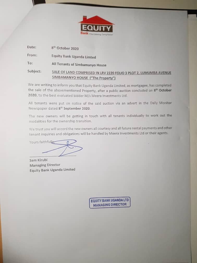 “We are writing to inform you that Equity Bank Uganda Limited, as mortgagee, has completed the sale of the above mentioned property, after a public auction concluded on october 8, 2020, to the evaluated bidder M/S Meera Investment Ltd. All the tenants were put on notice of the said auction via an advert in the Daily Monitor Newspaper dated September 8, 2020.” reads the notice.