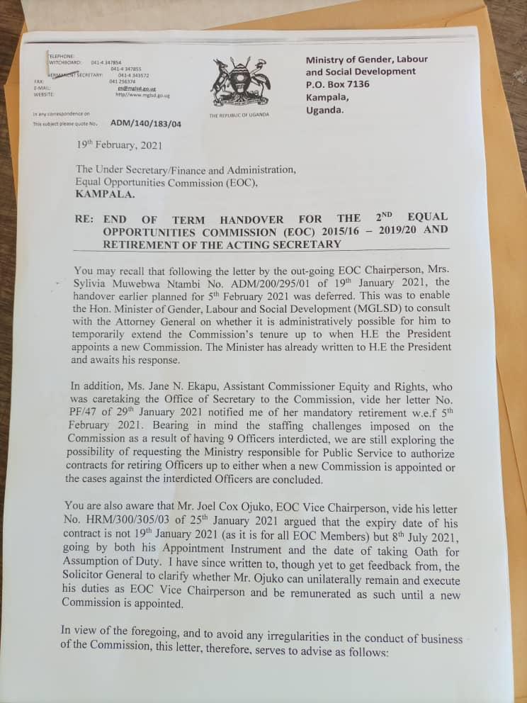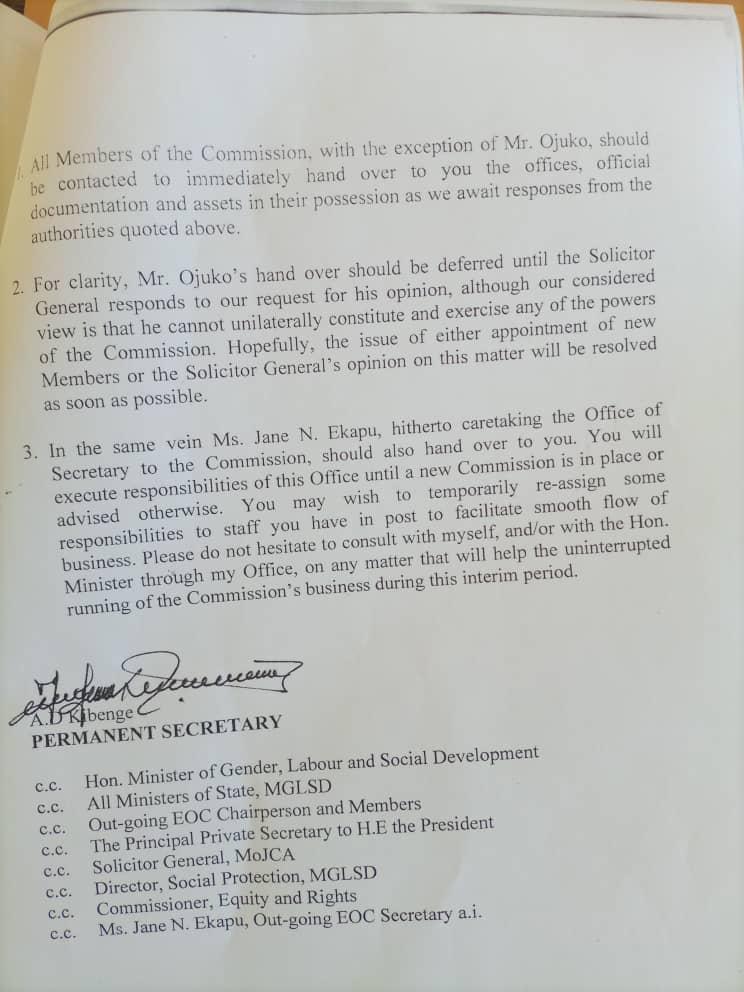 “You are also aware that Mr Joel Cox Ojuko, EOC Vice Chairperson, vide his letter No. HRM/300/305/03 of 29th January, 2021, argued that the expiry date of his contract is not 19th January 2021 (asit is for all EOC members) but 8th July 2021, going by both his appointment instrument and the date of taking oath for assumption of duty. I have since written to, though yet to get feedback from, the Solicitor General to clarify whether Mr Ojuko can unilaterally remain and execute his duties as EOC Vice Chairperson and be remunerated as such until a new commission is appointed” Mr. Kibenge wrote.