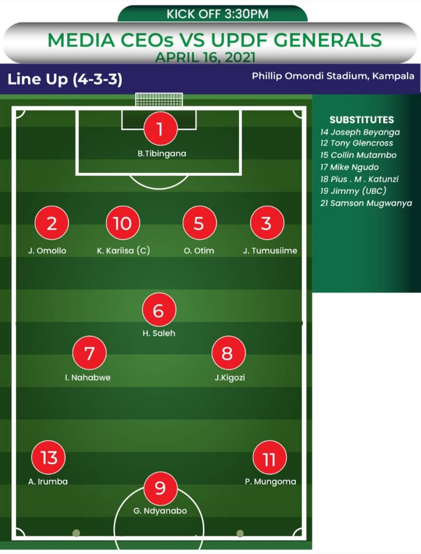 Two games will be played. The first shall be played between UPDF Generals and the directors with CEOs of the media houses while the second shall have junior officers and men playing against accompaniment of news readers, field reporters, news editors, bloggers and unmentioned media associates.