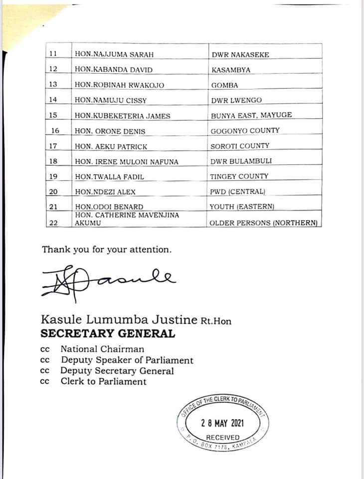 “I write in compliance with rules of parliament to forward to your office the names of twenty two (22) nominees of the National Resistance Movement to the Appointments Committee of Parliament”. The NRM Secretary General, Justine Lumumba wrote to the Speaker of Parliament, Jacob Oulanyah on May 28, 2021.