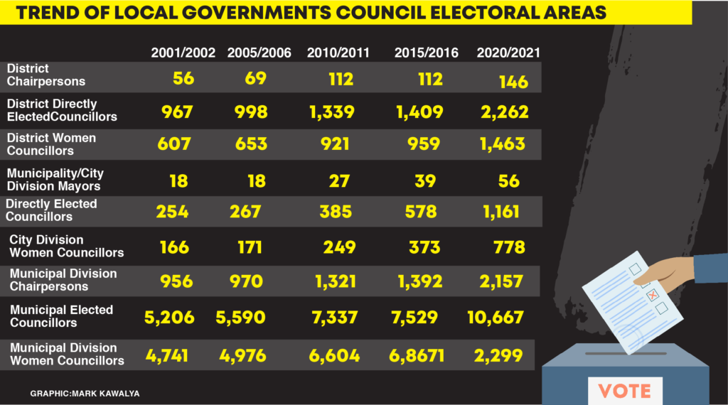 We had presidential, Parliamentary (Directly-elected MPs; District Women Representatives to Parliament and Representatives of Special Interest Groups, namely, Youths – 5; Workers 5; PWDs – 5; Older Persons – 5; and UPDF – 10).Local Government Councils (146 City and District Councils; 56 Municipality & City Division Councils; and 2,190 Sub County, Town and Municipal Division Councils).