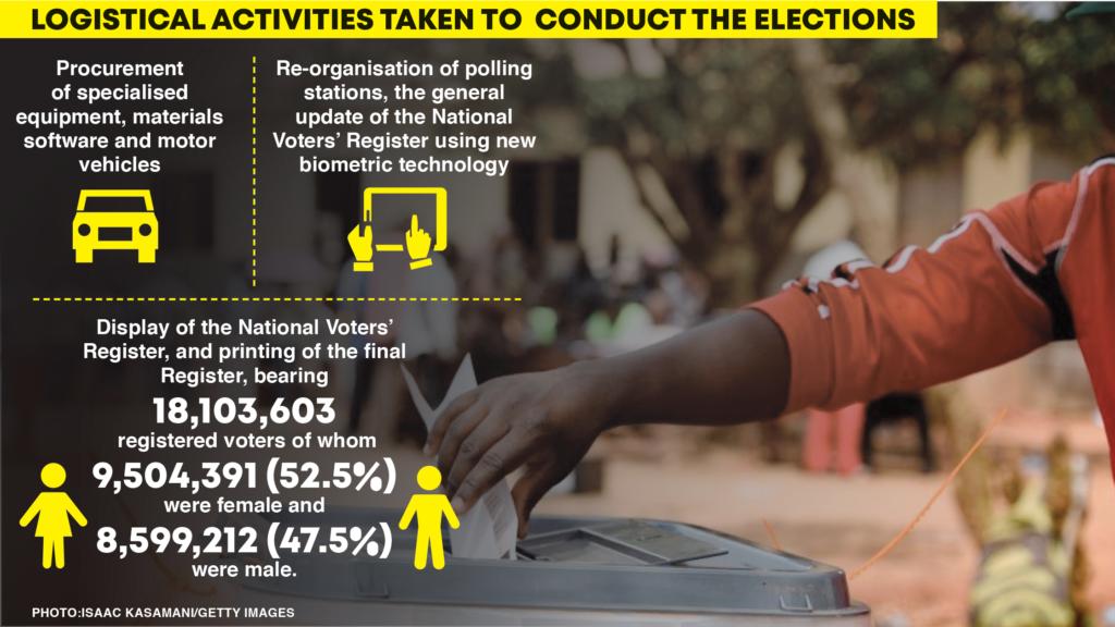 The elections were characterized by high participation as seen in the total number of 18,103,603 registered voters of whom 9,504,391 (52.5%) were female and 8,599,212 (47.5%) were male;A total of 10,744,319 voters cast their votes in the Presidential and Parliamentary Elections and other levels of elections;