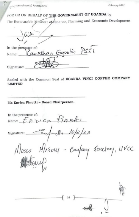 Ms Enrica Pinetti, the purported owner of Uganda Vinci Coffee Company Limited (UVCC) signed the $80million Coffee processing contract as a witness.