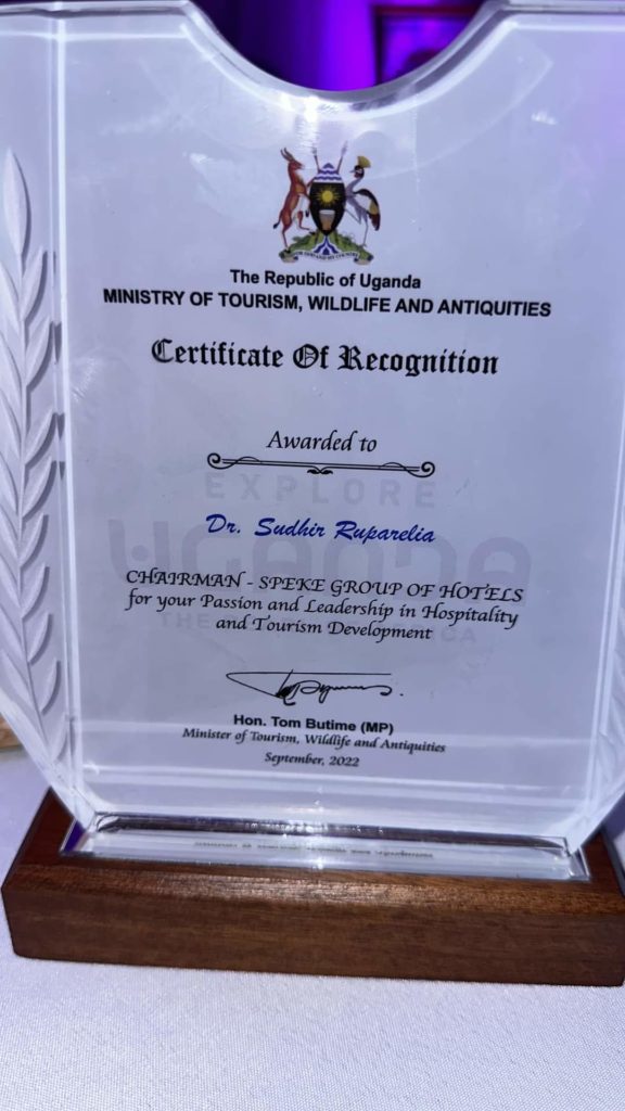 “In a special way, I congratulate Dr Sudhir Ruparelia, Chairman Speke Group of hotels for your Passion and Leadership in Hospitality and Tourism Development,” Tayebwa said.