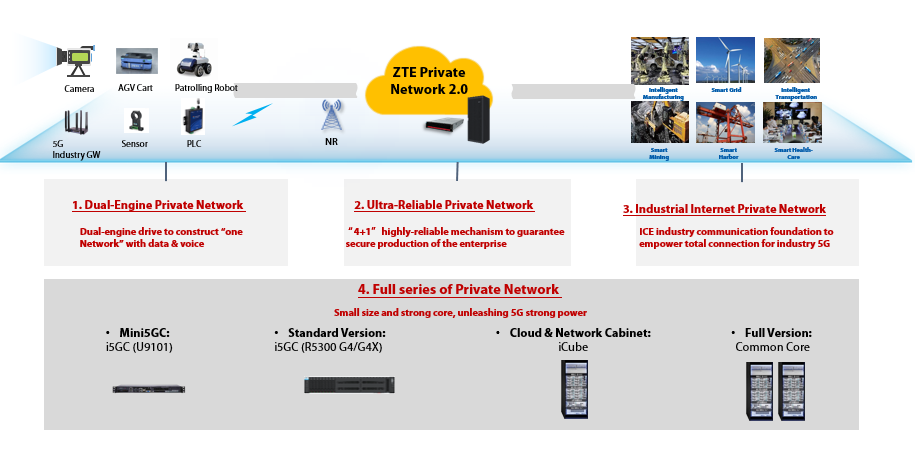 ZTE provides four series of private core network products (Mini5GC, standard i5GC, iCube, and Common Core) from the Mini version to the full version, flexibly meeting the deployment requirements in different scenarios in different industries.