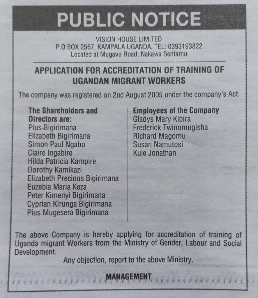 Bigirimana is one of the directors of Vision House Ltd and is the immediate former Permanent Secretary of the Ministry of Gender Labor and Social Development , an entity mandated to oversee the labor export business in the country.