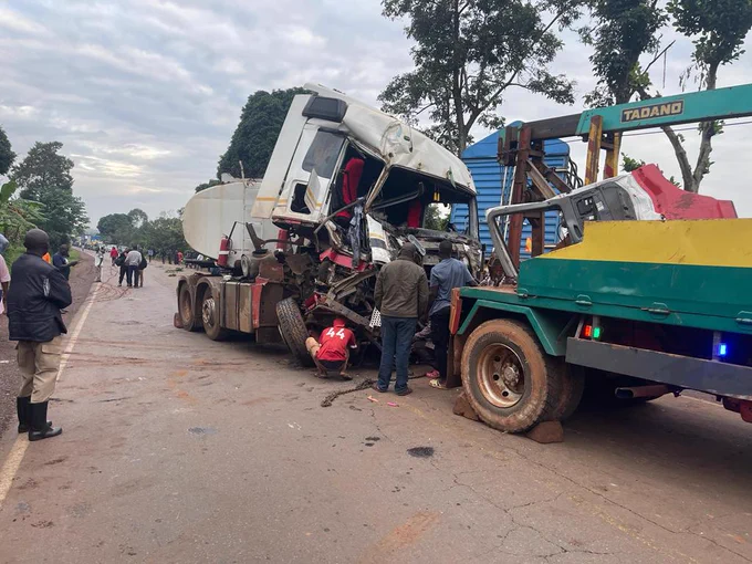 “According to preliminary findings, the Fuso Fighter with registration No.UBB 716F, driven by a yet to be identified person, was traveling from Jinja towards Kampala when it veered into the lane of oncoming traffic from Kampala, colliding with the M/Benz Fuel Tank vehicle (registration No. UAY 077A/UAY 928A) heading towards Jinja,” Butoto said.
