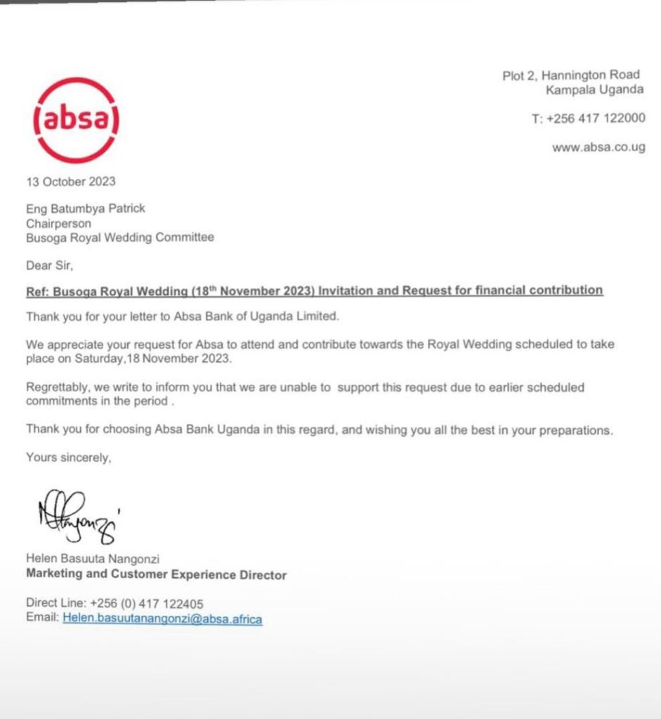 In a letter, Hellen Busuula, Absa marketing and customer Experience Director said, “We appreciate your request for Absa to attend and contribute towards the Royal Wedding scheduled to take place on Saturday, 18th 2023.”