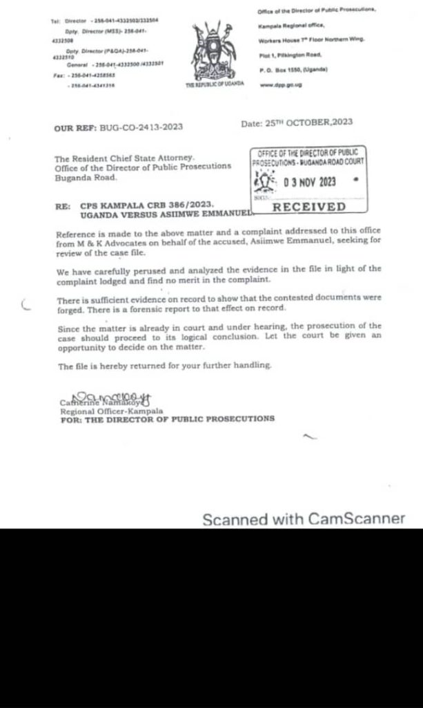 In one of the letters seen by this publication platform – referenced CPS Kampala CRB 386/2023, Uganda Vs Asiimwe Emmanuel, Catherine Namanya on behalf of the DPP clears the air. “We have carefully perused and analysed the evidence in the file in light of the complaint lodged and find no merit in the complaint. There is sufficient evidence on record to show that the contested documents were forged. There is a forensic report to that effect on record. Since the matter is already in court and under hearing, the prosecution of the case should proceed to its legal conclusion. Let the court be given an opportunity to decide on the matter……..” the letter reads in part.