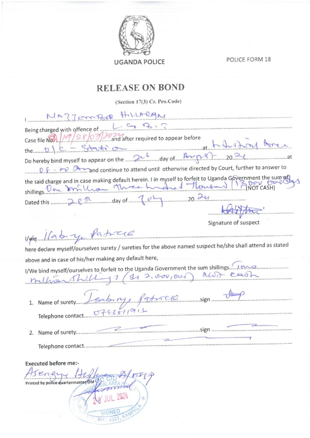 Following her initial detention, Najjemba was reportedly released on police bond pending further investigations. However, police later stated that she failed to comply with bond conditions and did not report as required. Authorities subsequently declared her whereabouts unknown, and as a result, police reportedly circulated a public notice within areas of her known residence, urging members of the public to provide any information that could assist in locating and rearresting her.