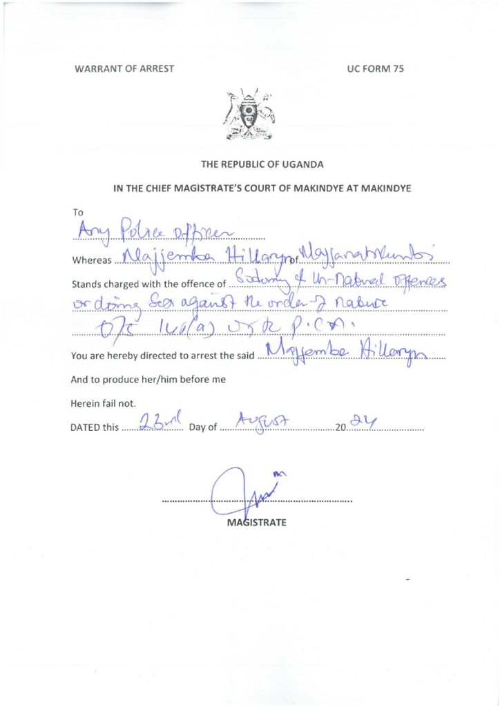 The Chief Magistrate’s Court of Makindye, on August 23, 2024, issued a warrant of arrest against a 21-year-old woman accused of engaging in homosexuality. The woman identified as Najjemba Hillaryn was reportedly arrested and taken into custody by police after authorities described her as a suspect in what they termed as a ‘lesbian relationship.” Sources familiar with the matter indicate that the arrest followed a tip-off from the local community.