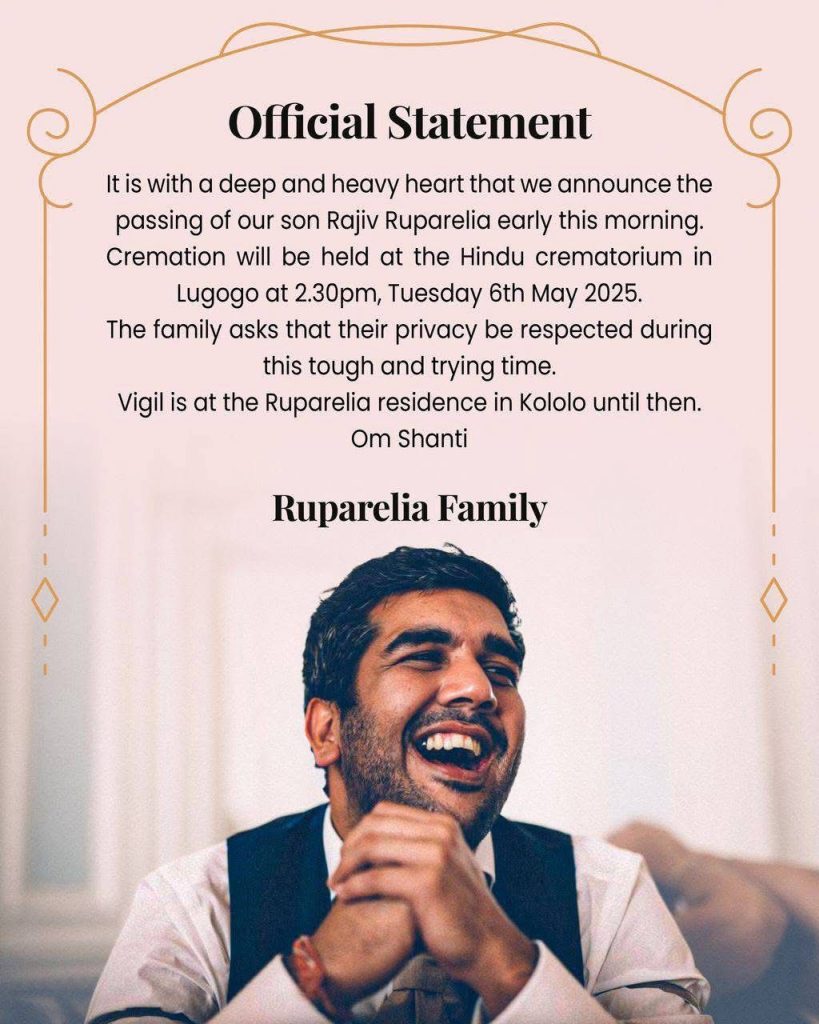 “It is with a deep and heavy heart that we announce the passing of our son Rajiv Ruparelia early this morning. cremation will be held at the Hindu crematorium in Lugogo at 2.30 pm, Tuesday May 6, 2025. The family asks that their privacy be respected during this tough and trying time”.