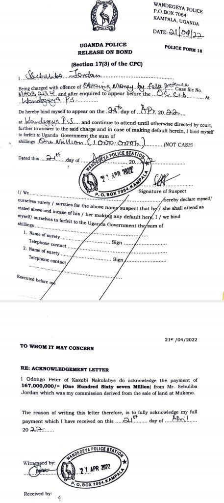 One April 21, 2021, Ssebuliba was given a release bond after being charged for obtaining money by false pretense under the case file no. MHOB 234 and was enquired to appear before the O.C CID at Wandegeya Police Station. He bound himself to appear at the station on of April 25, 2022 and failure to attend was required to pay Shs1 million. Sebuliba had falsely obtained Shs167,000,000/= (one hundred sixty-seven million) from Peter Odongo of Kasubi Nakulabye for the sale of land at Mukono.