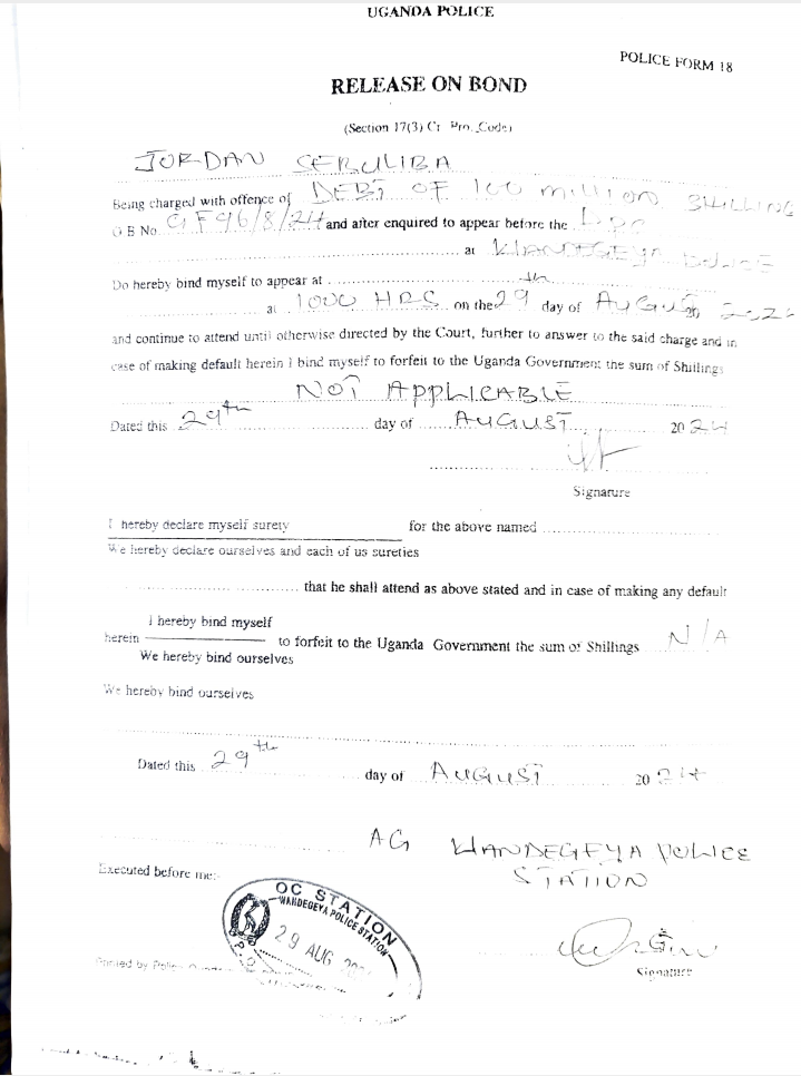 On August 29, 2024, Ssebuliba was further released on bond after being charged with the debt of Shs100 million and was enquired to appear before the DPC at Wandegeya Police Station.
