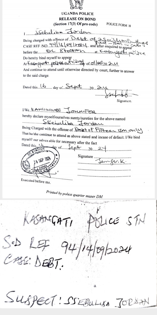 As of September 16, 2024, Ssebuliba was released on bond after being charged with debt of Shs25 million and paid Shs10m and after enquired to appear before the OC station at Kansanga Police. He bound himself to appear at Kansanga Police station on Friday, October, 1, 2024 to continue and attend until otherwise as directed by the court further to answer the said charge. A one Jennifer Kangugure declared surety and bound to pay the remaining Shs15 million.
