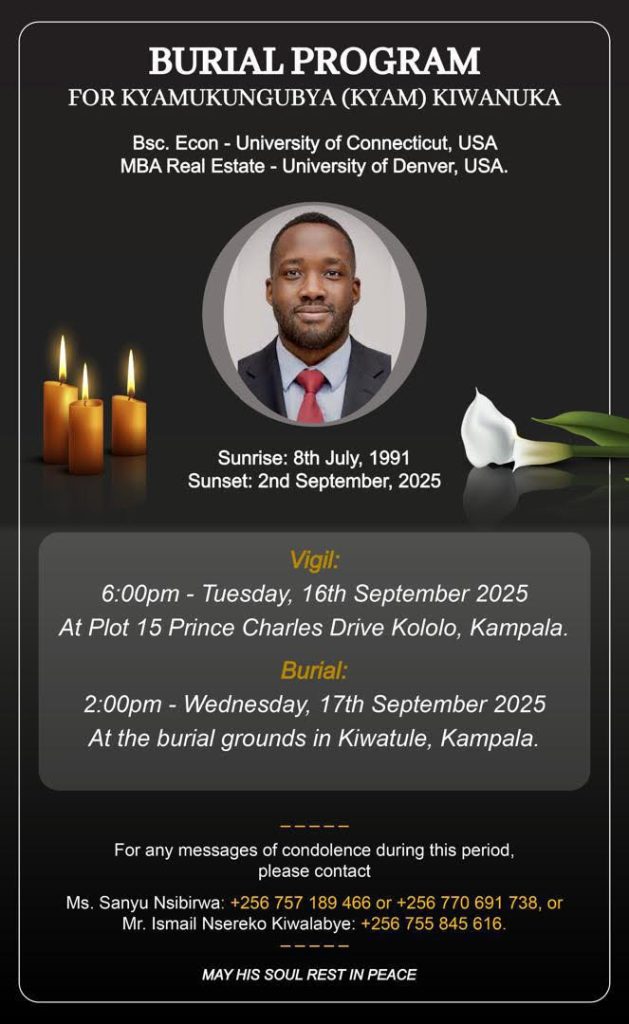 The family of city businessman Mohan Kiwanuka and his wife, former Finance Minister and current Presidential Advisor Maria Kiwanuka, is set to bury their son Kyamukunguya Nsereko Kiwanuka on Wednesday, September 17, 2025, at their burial grounds in Kiwatule, Kampala.