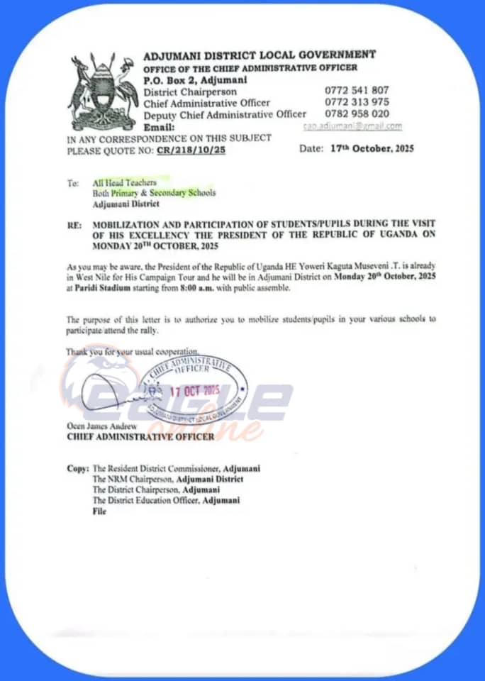 In a letter dated October 17, 2025, to all school heads that has since been circulated widely on social media, Ocen orders them to mobilise students and pupils in the various schools to participate in the rally.