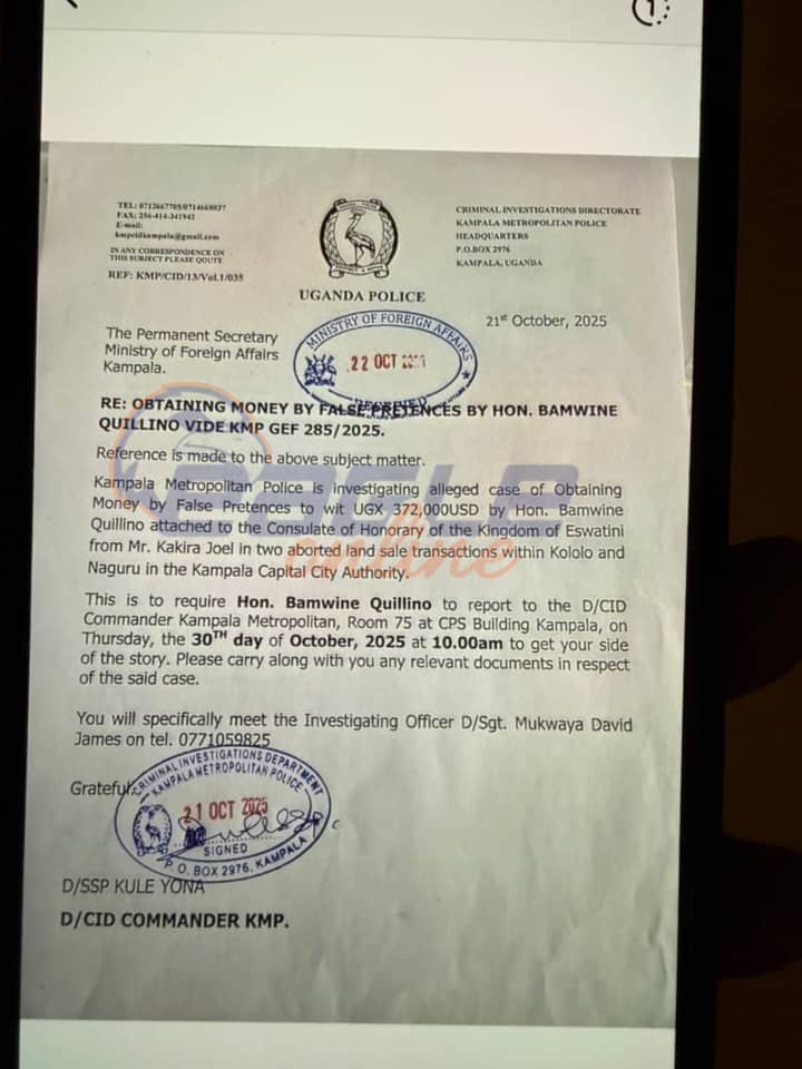 The letter, under reference KMP/CID/13/Vol 1/035, reads in part, “Kampala Metropolitan Police is investigating an alleged case of Obtaining Money by False Pretences to wit USD 372,000 by Bamwine Quillino attached to the Consulate of Honorary of the Kingdom of Eswatini from Mr. Kakira Joel in two aborted land sale transactions within Kololo and Naguru in Kampala Capital City Authority.”