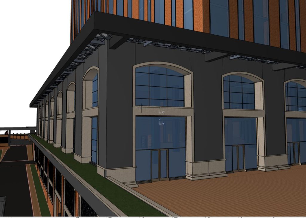 At the lower levels, the building opens into wide terraces supported by large columns. Arched windows and expansive walkways dominate the podium which creates space intended for commercial and public use.