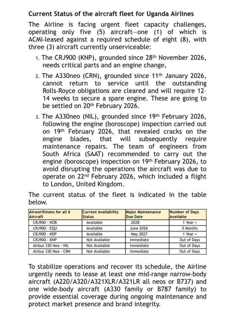 “Uganda Airlines wishes to inform our esteemed guests that two of our long-haul aircraft are temporarily out of service due to unscheduled maintenance,” the airline said.