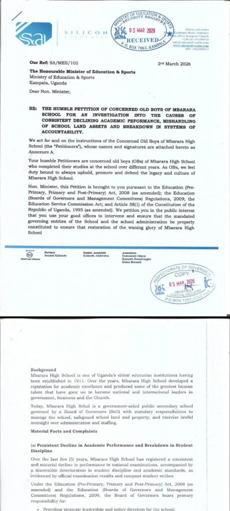 March 5, 2026-Mbarara – Former students of Mbarara High School have petitioned the Ministry of Education and Sports, expressing deep concern over the school’s declining academic performance, questionable governance, and alleged mismanagement of school land.