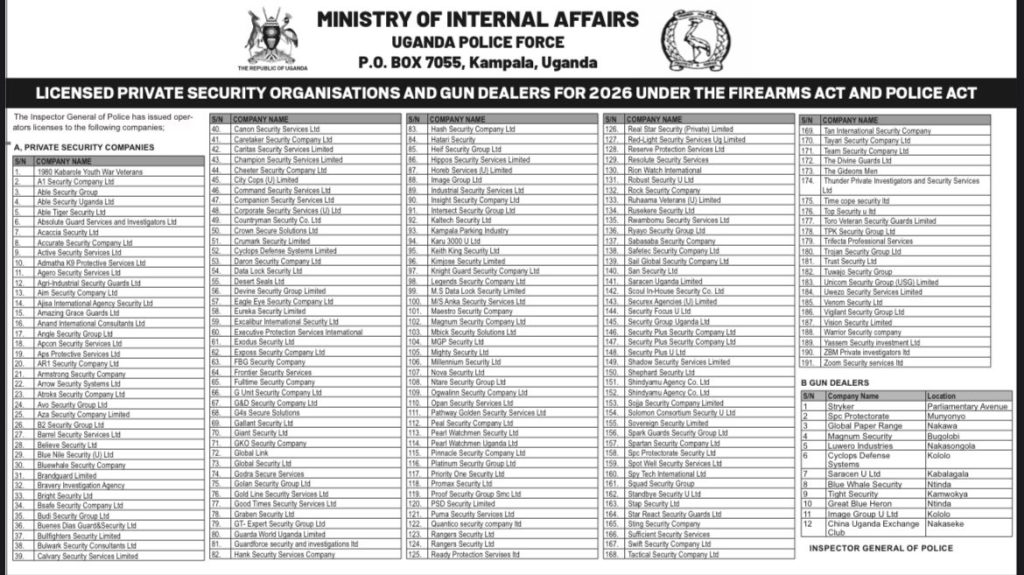 The Uganda Police Force has released the official list of licensed private security organizations and gun dealers authorized to operate in Uganda in 2026 under the provisions of the Firearms Act of Uganda and the Police Act of Uganda.
