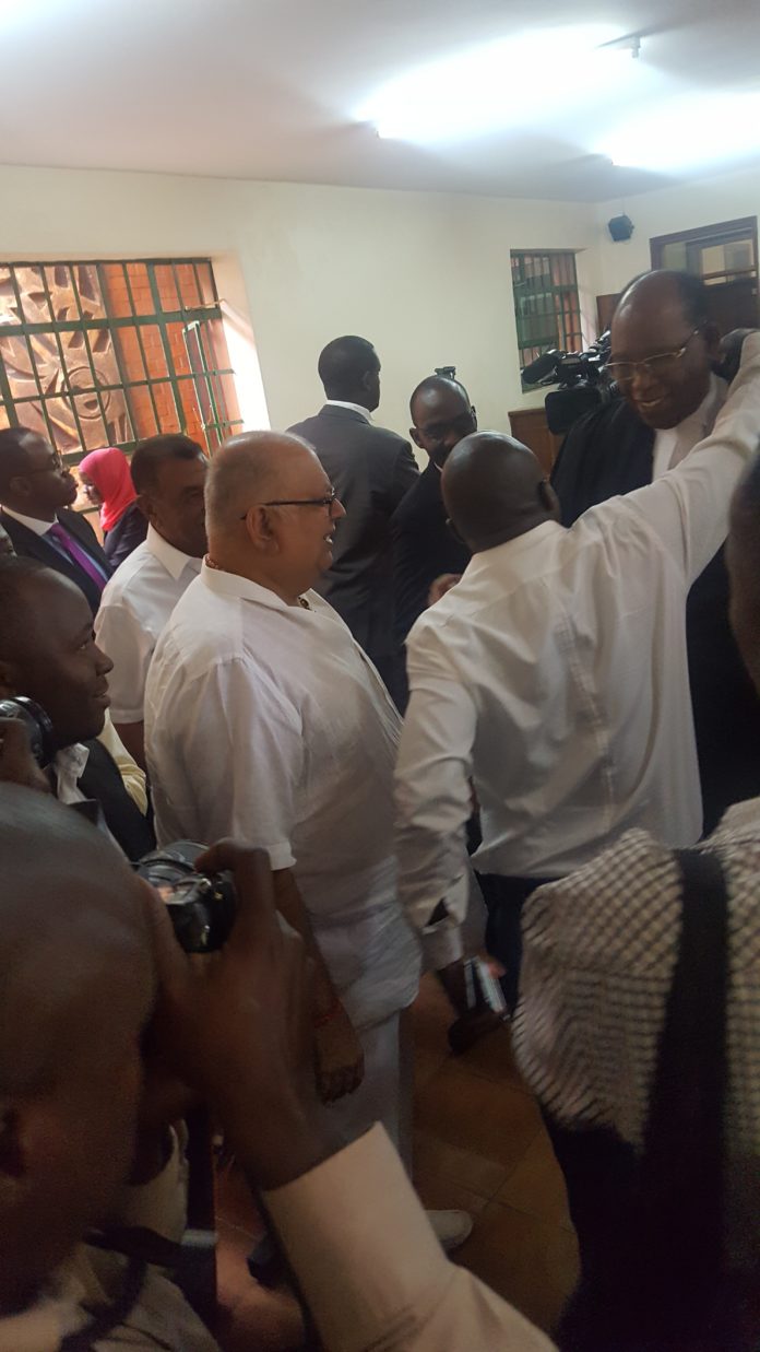 City tycoon Sudhir Ruparelia discusses with his lawyers and friends after the court ruling