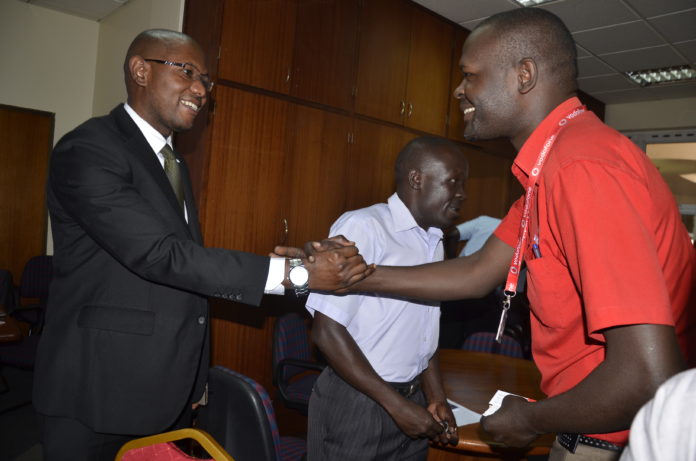 Ronald Kasasa, Head of Business Banking, DFCU Bank sharing a moment with Vodafone Uganda's SME Direct Sales Executive, Abdunasil Wavamuno (right) at a Contractors Sector Meeting in Kampala