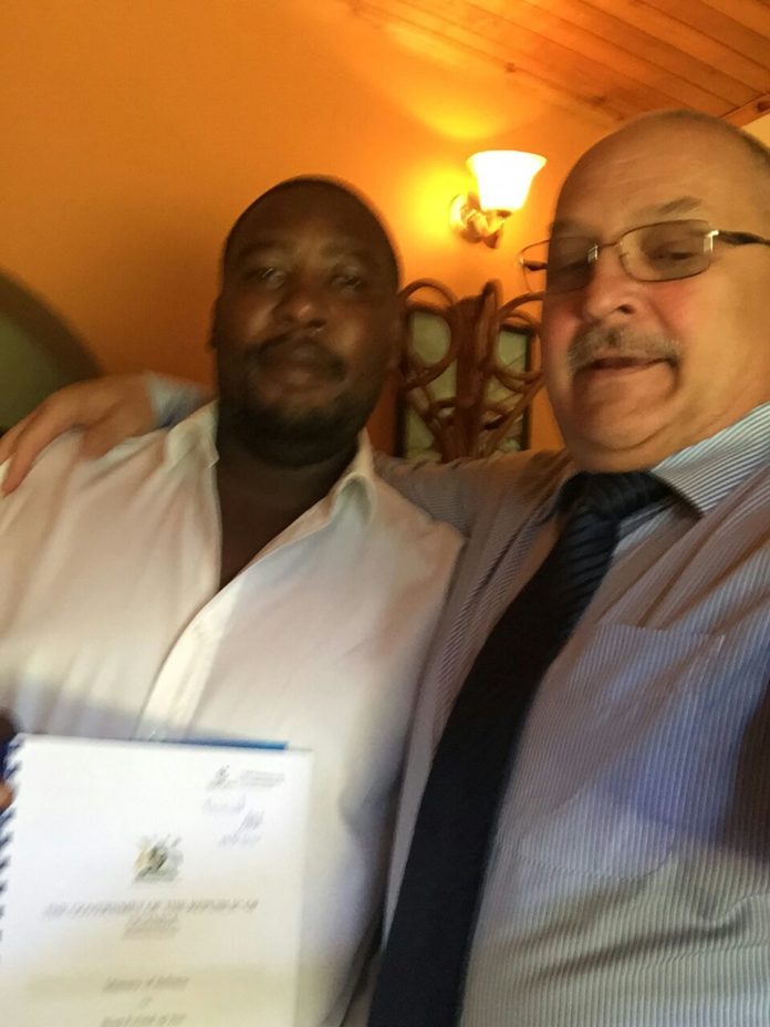 The Vice Chancellor of the Kigali Independent University Dr, Ezechiel Sekibibi hands over a certifi cate to Muhumuza Umar from the Mbarara University of Science and Technology (the new EAC Youth Ambassador for Uganda).