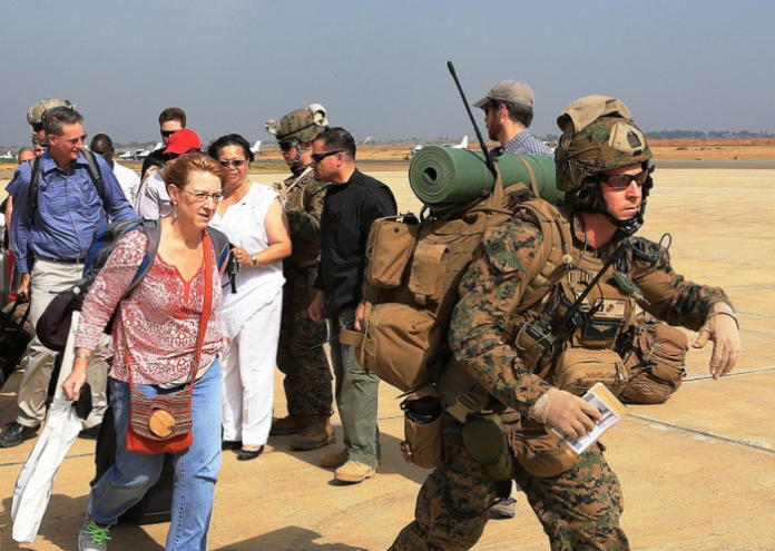 A US Marines guides US citizens during a previous evacuation from Juba