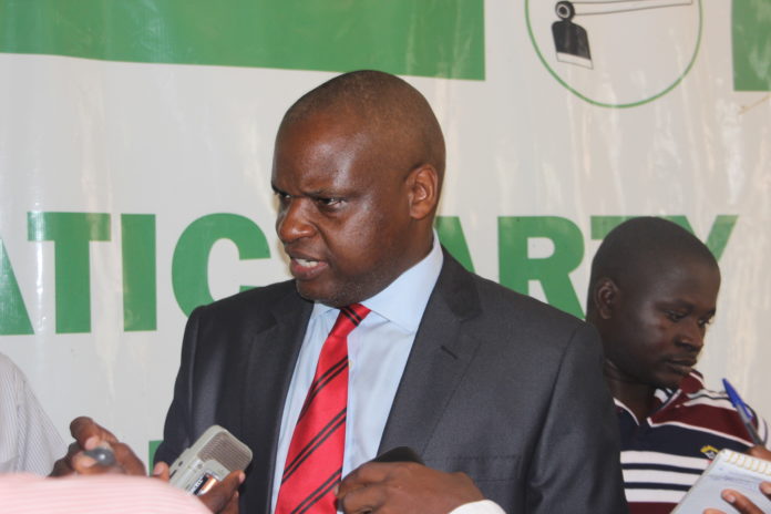 Democratic Party Spokesperson, Kenneth Paul Kakande (R) addresses the media at a past function
