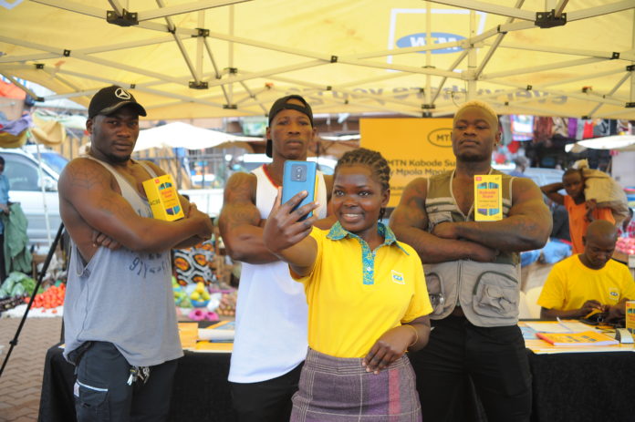 A lady poses for a selfie with the MTN Kabode Supa Smartphone standing next to Kabode men. Kabode stands for strong meaning the phone is built to last long