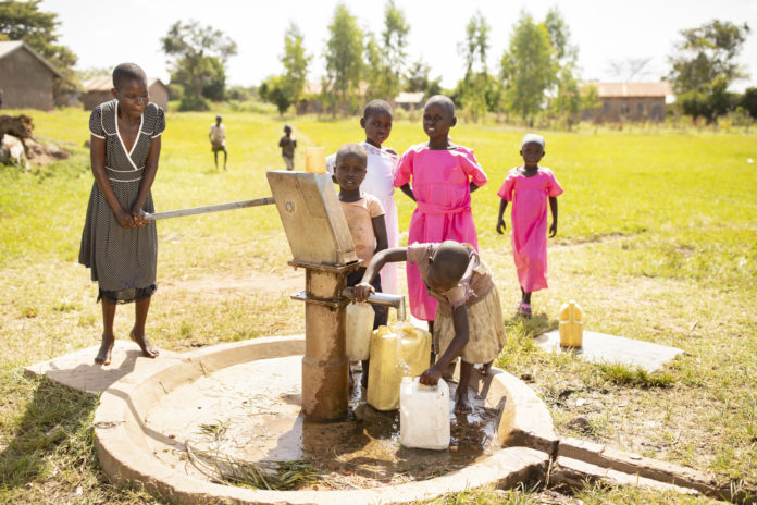 Children access clean water at a well installed by ChildFund in Butaleja District