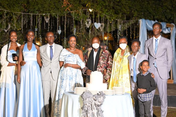 President Yoweri Museveni and First Lady Janet Kataaha Museveni pose for a family photo while marking 25 years of their daughter Natasha Karugire’s marriage to lawyer and businessman Edwin Karugire.