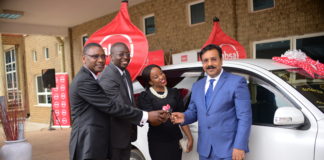 Enid Zawedde gets a car in Wangula Emotoka Bancassurance campaign